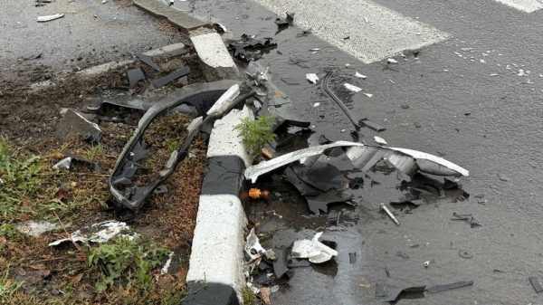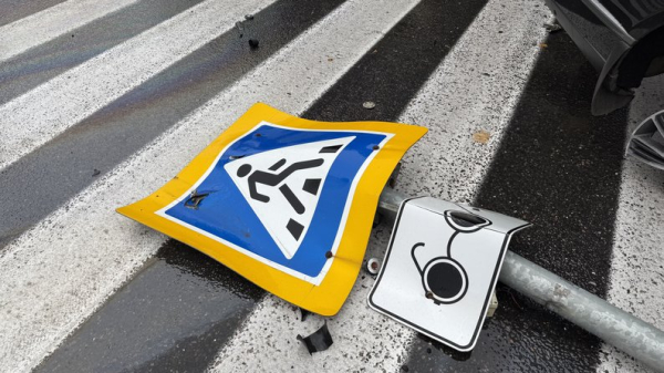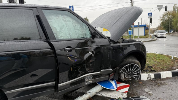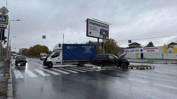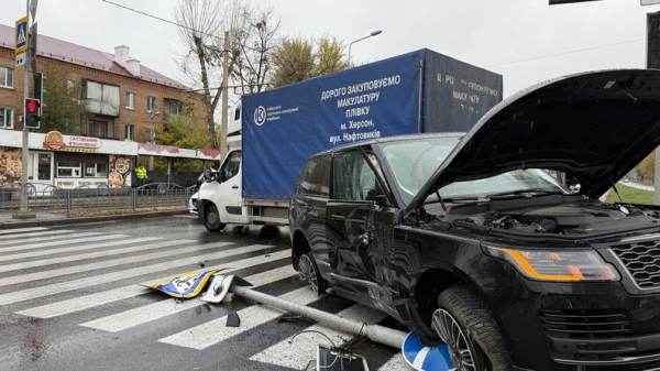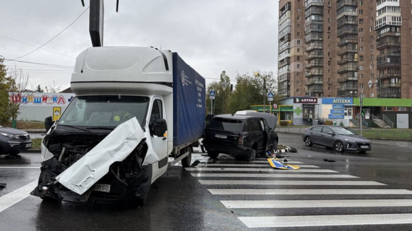21 жовтня вранці на вулиці Клочківській у Харкові на пішохідному переході стоять чорний позашляховик Land Rover і вантажний фургон з ознаками ДТП: у обох пошкоджені бампери, у позашляховика — права сторона.
