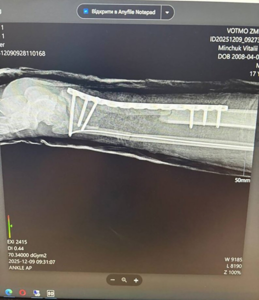 Хірурги Волинської обласної дитячої клінічної лікарні врятували ногу 16-річному Віталію Мінчуку з Камінь‑Каширського району після ДТП 30 листопада: під час зіткнення мотоцикла з автомобілем хлопець зазнав майже повної ампутації лівої гомілки.