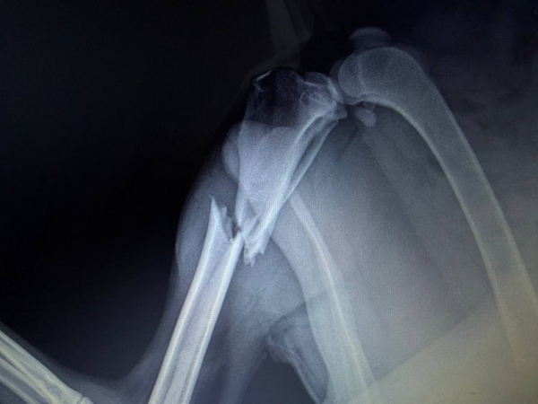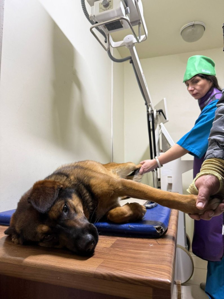 Песик молодий, менше двох років. У нього діагностували перелом гомілки задньої лапи. Провели термінову операцію — вона пройшла успішно, лапка заживає, тварина поступово відновлюється.