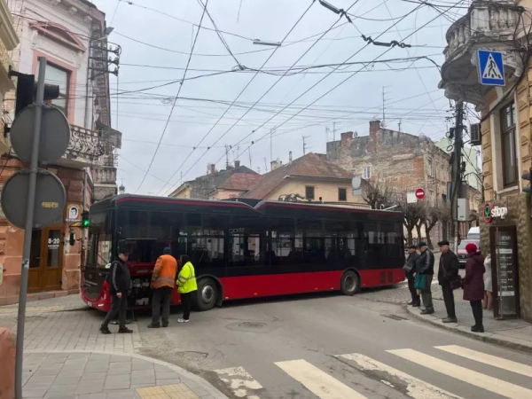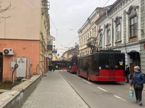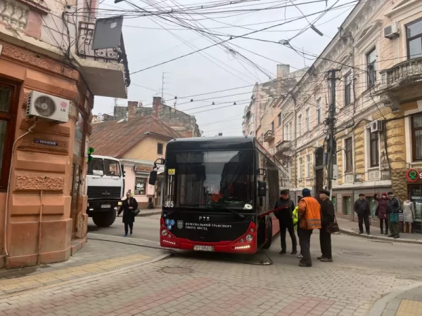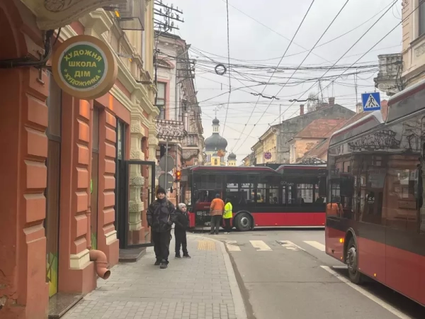 У Чернівцях на розі вулиць Руська та Українська тролейбус розвернуло і він повністю загородив проїзд.
