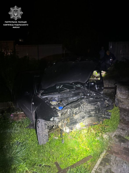 На Хмельниччині 18-річний водій розбив і машину та зніс огорожу. Фото: Патрульна поліція Кам’янець-Подільського району