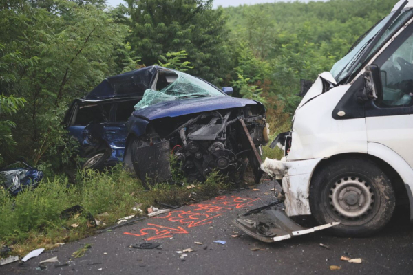За попередніми даними, VW рухався на великій швидкості й занесло на мокрій дорозі під час повороту. Ліва частина легковика практично знищена, передня частина мікроавтобуса розчавлена, двигун вирвано — це свідчить про дуже сильний удар. Судово‑медичний експерт розслідує обставини аварії.