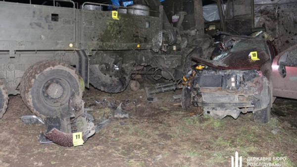 Аварія сталася близько 21:15. Водій автомобіля Nissan з військовими номерними знаками не впорався з керуванням на повороті, виїхав за межі проїзної частини та врізався у нерухому вантажівку.